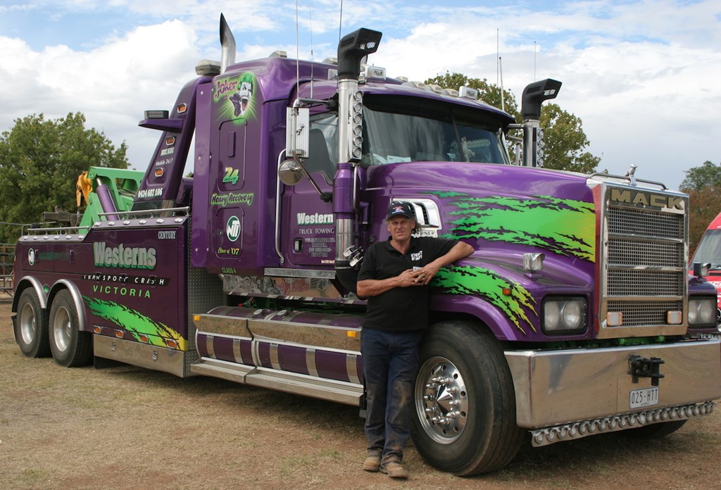 He is leaning on the purple Mack Super-Liner LT he drives for Western Truck Towing. It features a mural of the Joker but it is a serious performer at heavy vehicle recoveries.
